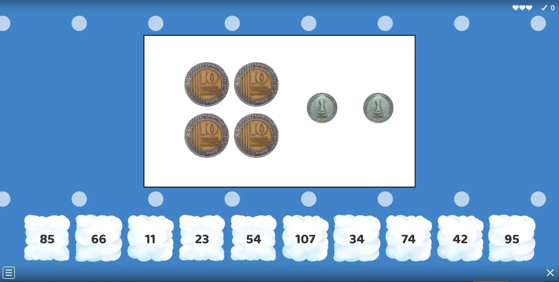 המשחקים מחולקים לפי נושאים: המספרים הטבעיים בתחום ה100, פעולות חשבון: חיבור וחיסור עד 10,